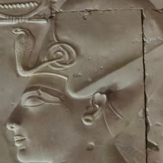 This example seems to have combined both methods in that it keeps the rather smooth modeling of the face but manages to carve deep enough for the relief to pick up enough light to create subtle areas of light and shadow around the nose and chin. The more deeply carved areas around the crown, the cobra head, and the necklace, add to the simple beauty of the face by contrasting those details with the smoothness that the face is rendered with. The eye is a traditional forward-facing eye, yet carved to indicate a roundness under the lid, with a slight indentation behind the nose, rather than being just flat. It has been said that there are touches of an Amarna influence here that show that the art of that controversial period outlasted its religious revolution. Interestingly, the king's cap crown seems to have a design of small curls, whether that is reminiscent of hair one does not know. Though it is known that Seti I kept his head shaven and wore wigs of the kind used by the upper echelons of the military, which was his power base.